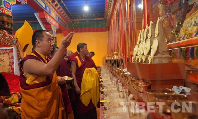 圖為十一世班禪在桑普寺拋灑青稞、祈愿豐收 攝影:王淑