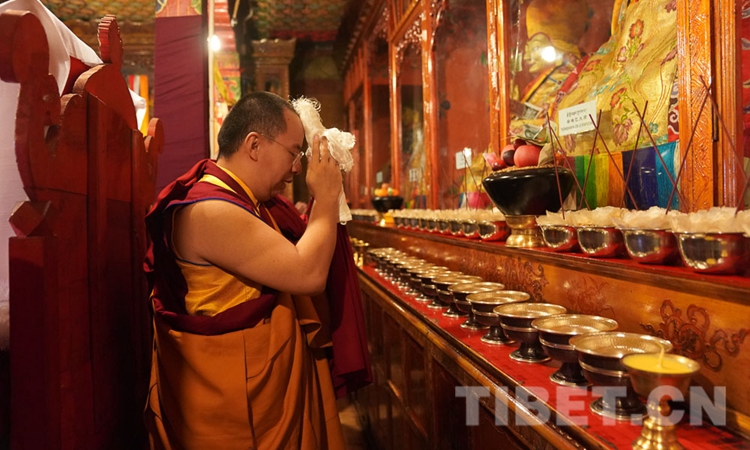 圖為十一世班禪在乳巴寺向佛像敬獻(xiàn)哈達(dá) 攝影:鄭朔