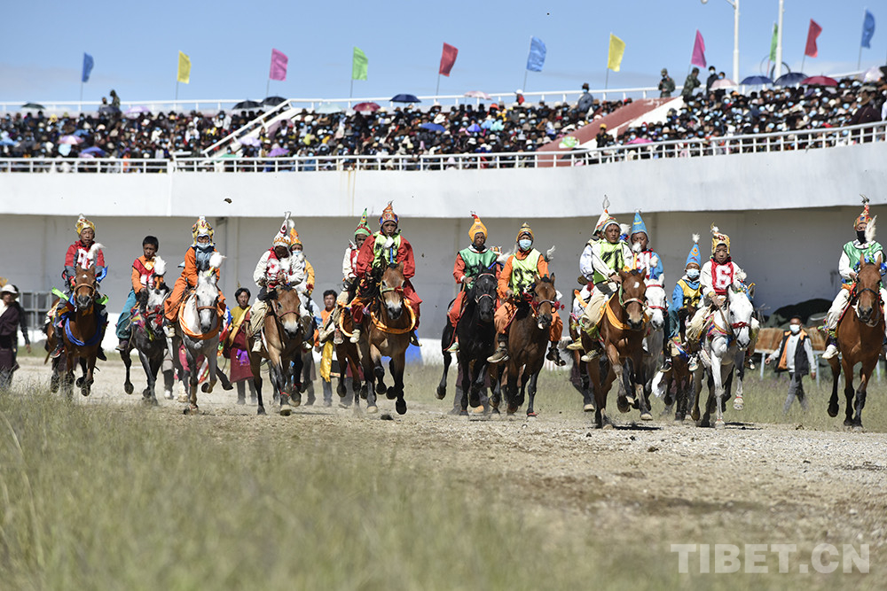 8月12日上午,西藏自治區(qū)那曲市2020羌塘恰青格薩爾賽馬藝術(shù)節(jié)的重頭戲——場(chǎng)內(nèi)速度賽馬比賽開(kāi)始。賽道內(nèi),沙塵飛濺;看臺(tái)上,座無(wú)虛席,吶喊助威。