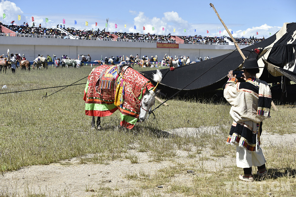 看了兩組比賽后,三兄弟奔跑到集合地點(diǎn),要準(zhǔn)備比賽了??粗绺缋蜕V楹瓦_(dá)瓦頓珠頭戴盔狀帽子、上穿黃色藏式上衣、手持竹把小鞭子,11歲的丹增久典滿(mǎn)是羨慕?!拔乙蚕腧T馬、去比賽,爸爸說(shuō)還不到年齡?!?/p>
