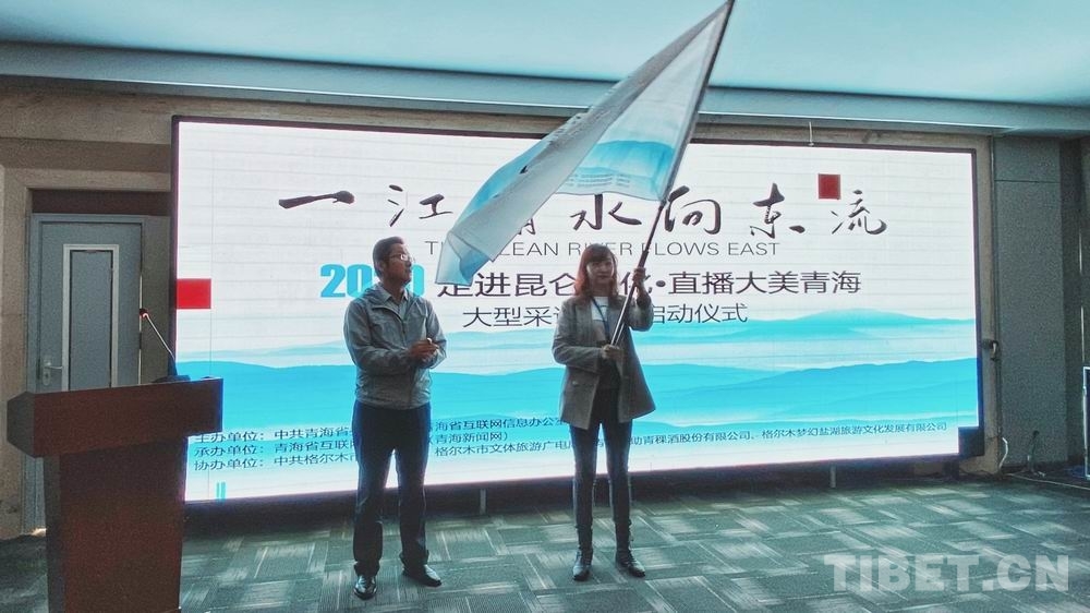 圖為“一江清水向東流——2020走進(jìn)昆侖文化 直播大美青?!贝笮筒稍L活動啟動儀式授旗現(xiàn)場 青海新聞網(wǎng)供圖