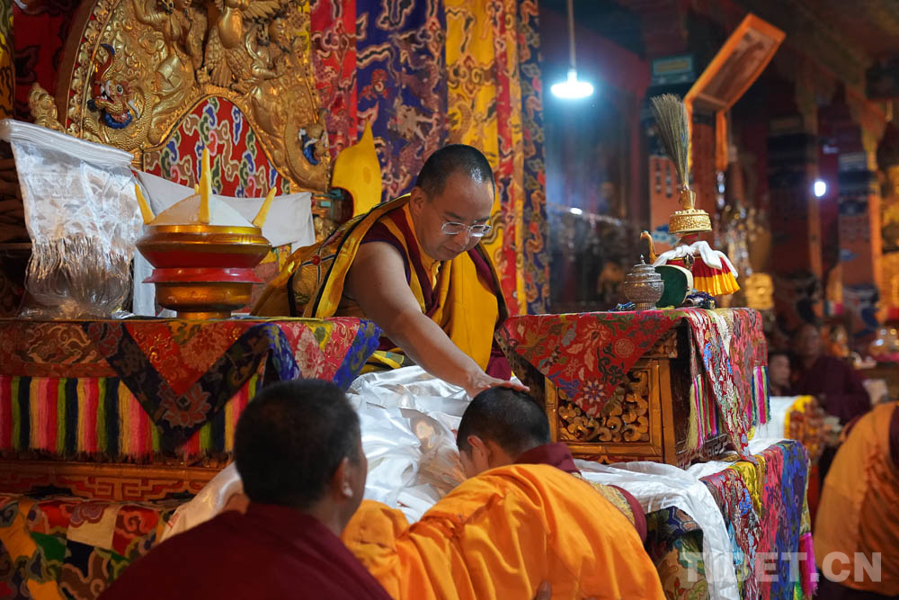 青山之下,桑煙裊裊、法號長鳴的那曲市索縣榮布熱登寺迎來了十一世班禪。8月23日,在200余名僧眾的期盼中,十一世班禪在杜康殿為寺院僧眾摸頂、傳經(jīng)。