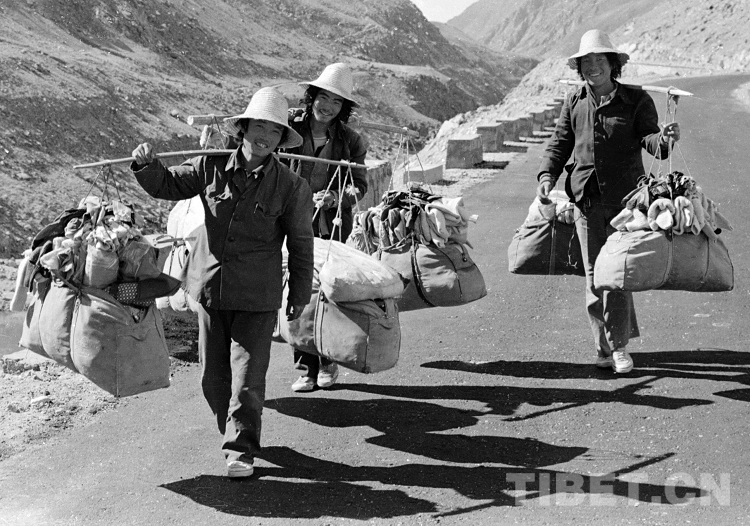 這是三位肩挑商品,走進藏北高原的內(nèi)地“候鳥”型貨郎(唐召明1989年攝)