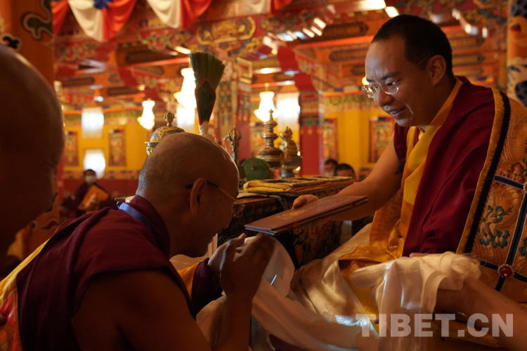 圖為十一世班禪為薩迦教派高僧頒發(fā)然講巴學位證書 攝影:王淑
