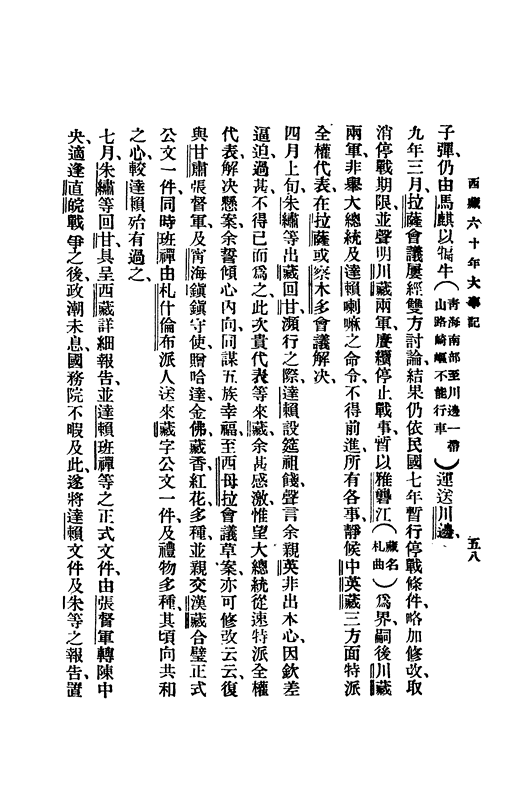 那么,何以后來(lái)出現(xiàn)朱繡為代表團(tuán)負(fù)責(zé)人一說呢?原來(lái)朱繡進(jìn)藏前,就“于藏事先后得失情形,了如親歷”“每與談及藏事,批隙導(dǎo)竅,理解豁然”。此次,他赴藏耳聞目睹感受更深,痛感“訌內(nèi)虎紛爭(zhēng),烈烈邊風(fēng)急”。 他在代表團(tuán)的報(bào)告未獲重視后,慮及有關(guān)西藏近代歷史尚無(wú)一可資借鑒之書,而“國(guó)人與政府又太不明了邊事”,決定將西藏近六十年的大事輯為一冊(cè),以供“留心邊事者一助”。他利用閑暇時(shí)間,查找有關(guān)資料,如條約、公文等,并四處奔走,調(diào)查川藏前后戰(zhàn)爭(zhēng)情形,最終于1925年將書印行問世,為后人了解和研究西藏這段特殊的歷史時(shí)期留下了不可多得的資料。