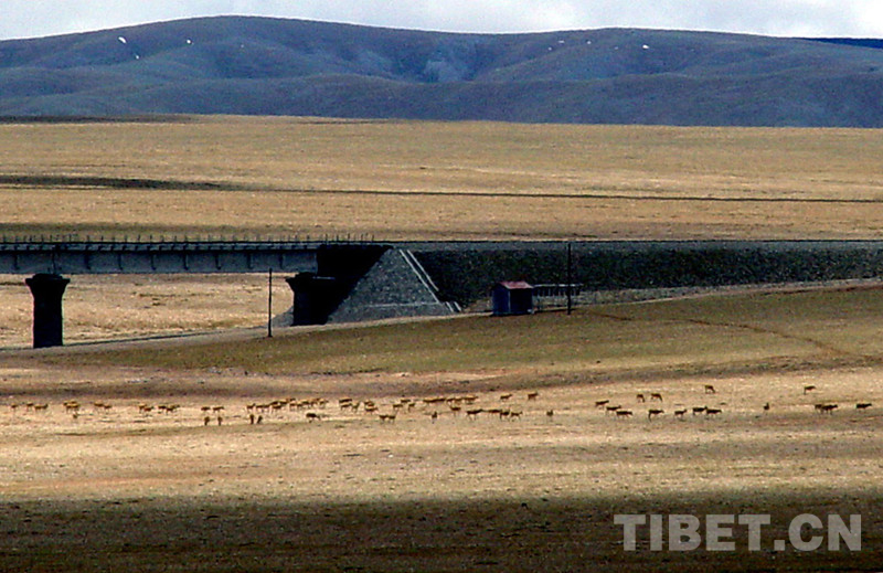 藏北高原,在藏語(yǔ)里稱為“羌塘”。這里棲息著的藏羚羊,每年春夏季都會(huì)大規(guī)模由南向北長(zhǎng)距離遷徙,五道梁至楚瑪爾河一帶是必經(jīng)之路。為了保證藏羚羊自由遷徙,青藏鐵路在這里設(shè)立了四處野生動(dòng)物通道。其中長(zhǎng)11.7公里的清水河特大橋和長(zhǎng)4公里的楚瑪爾特大橋,采取“以橋代路”形式設(shè)計(jì)動(dòng)物通道,供野生動(dòng)物通過(guò)。