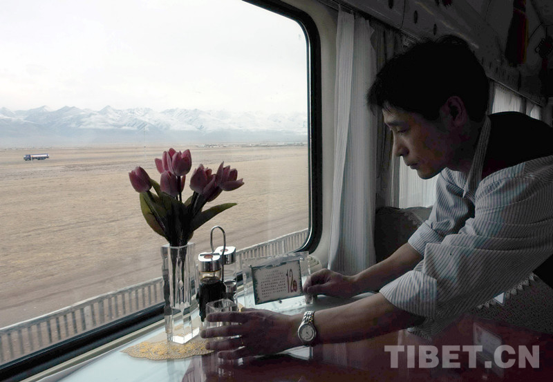 圖為全部為密封車窗,以防旅客投擲雜物。在通過(guò)藏北高原時(shí),一位餐車人員正在整理餐桌(唐召明2014年攝)