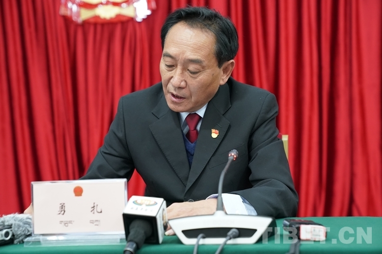 圖為西藏自治區(qū)人大法制委員會(huì)副主任委員勇扎介紹有關(guān)情況 攝影:王淑