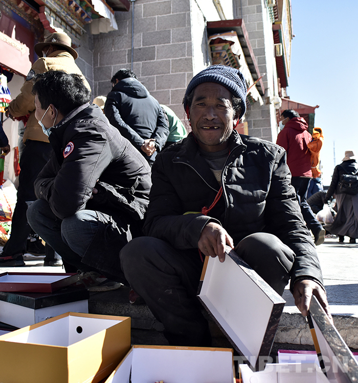圖為在八廓商城外售賣酥油花的農(nóng)牧民 攝影:王媛媛