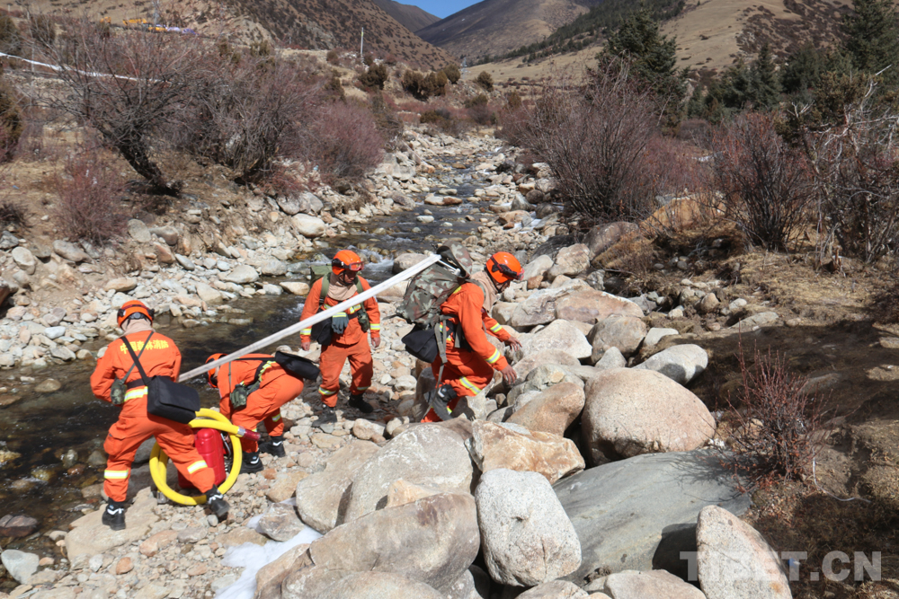 圖為左貢縣森林消防中隊(duì)消防員正在鋪設(shè)管帶