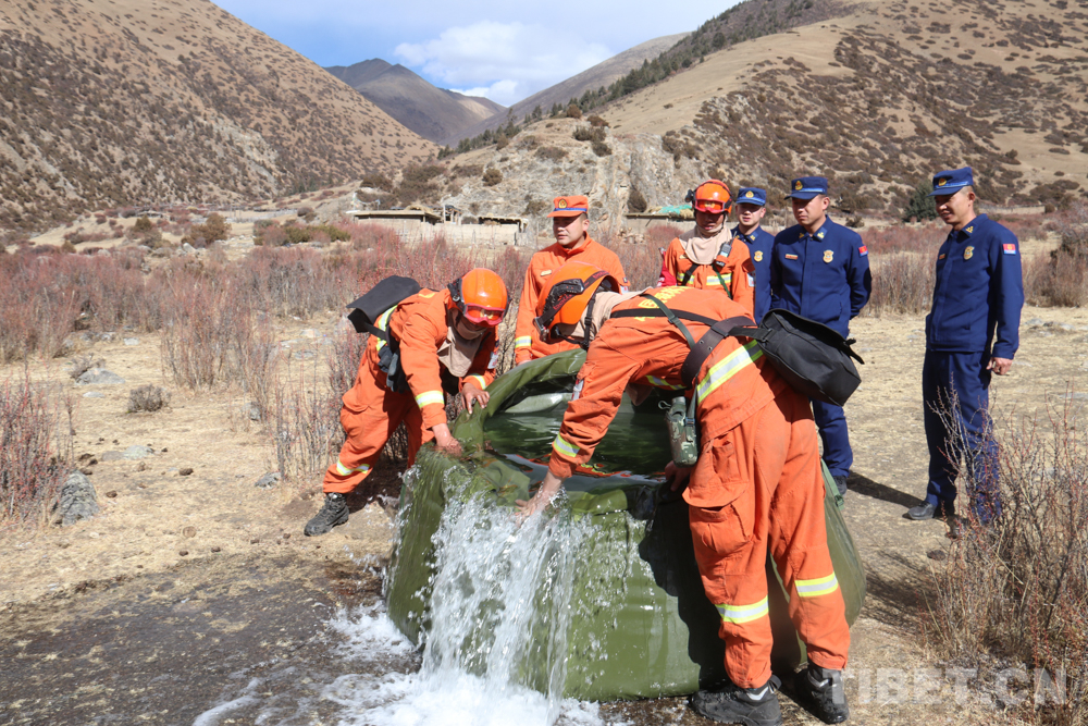 雖然今年10月才滿22歲,但蘇富康進(jìn)入森林消防隊(duì)伍已經(jīng)快4年了,有著豐富的野外山地水泵架設(shè)經(jīng)驗(yàn)。只見(jiàn)他迅速蹲下,拔開(kāi)蓄水池充氣塞,將頭貼上蓄水池,用嘴對(duì)著氣孔吹了起來(lái)。等到滿臉漲紅,池子“站”穩(wěn),才熟練地把充氣塞重新蓋上。他回過(guò)頭對(duì)著嘎瑪珠杰笑道:“給蓄水池吹氣的時(shí)候要像吹氣球一樣使勁地吹,不然他就會(huì)偷懶,站不起來(lái),你以后吹多了就明白了?!?/p>