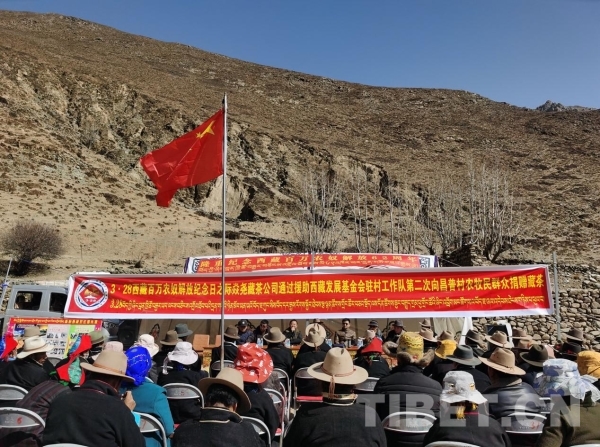 援助西藏發(fā)展基金會(huì)駐多角鄉(xiāng)昌普村工作隊(duì)與雅安相關(guān)藏茶公司向昌木普村每位村民獻(xiàn)上哈達(dá)并捐贈(zèng)60份優(yōu)質(zhì)藏茶,表達(dá)對(duì)全體村民深情祝福。
