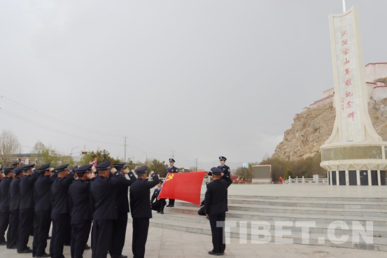圖為康馬邊境管理大隊(duì)民警在江孜宗山英雄紀(jì)念碑前重溫入黨誓詞 楊朝祥 攝