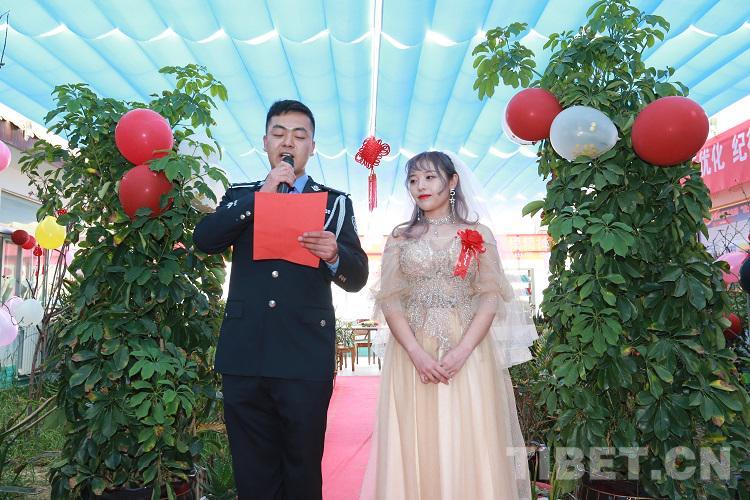 沒有鋪張豪華的迎親車隊(duì),沒有山珍海味的結(jié)婚宴席,大家在陽關(guān)房里鋪上紅地毯、掛上彩色氣球,用鮮花和彩帶巧手裝點(diǎn)禮堂。繽紛的喜字掛在墻上,讓平日里莊嚴(yán)肅穆的營區(qū)變成了另一番景象,讓新娘感受到了只有警嫂才有的至高禮遇。藏青藍(lán)與婚紗白交融,浪漫與忠誠在海拔4300米演繹著動(dòng)人的交響曲。