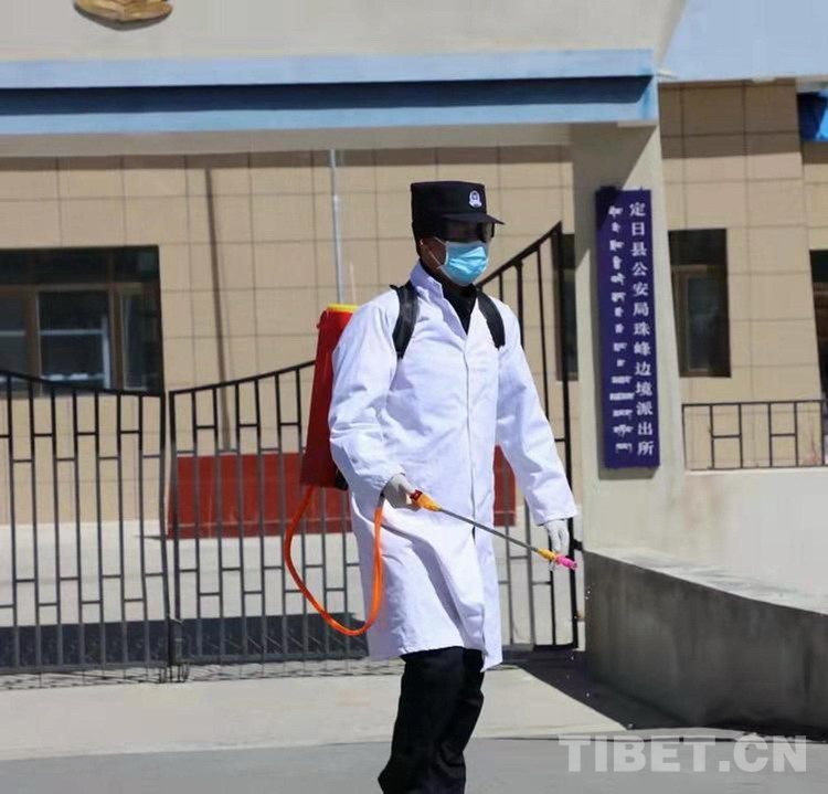 圖為格桑在新冠肺炎疫情期間進行消毒