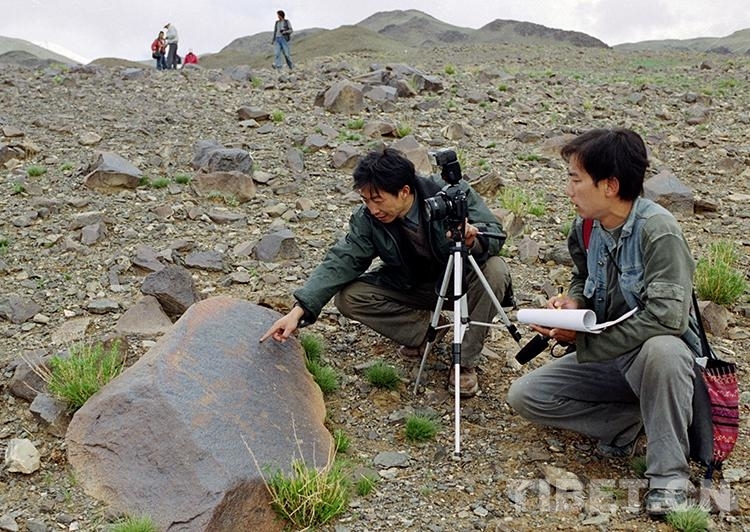 這是藏北無人區(qū)科考團(tuán)科考人員在對尼瑪縣榮瑪鄉(xiāng)加林山巖畫進(jìn)行科學(xué)考察(唐召明2001年攝)