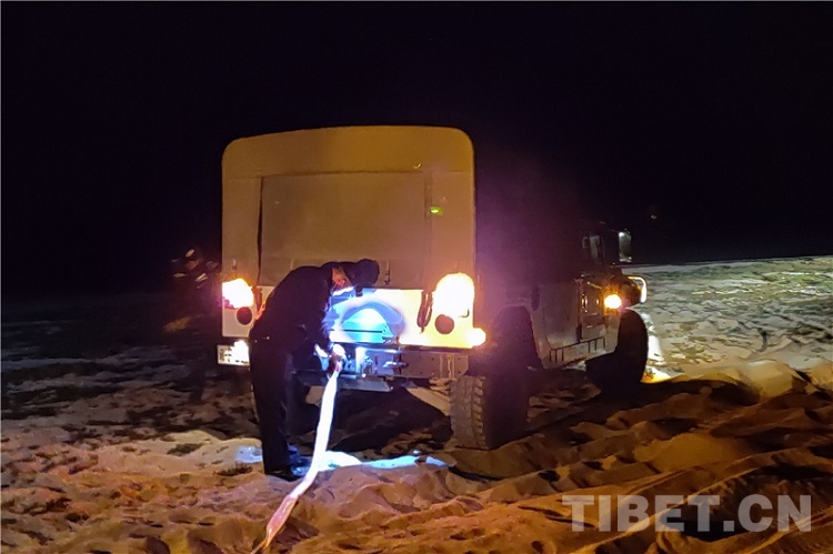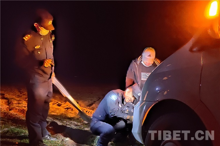 據(jù)了解,3名游客在自駕游玩過程中,想前往拉昂錯(cuò)湖邊停留一會再前往縣城。由于天黑視線模糊,在湖邊行駛時(shí)誤入沙地,立即開始倒車自救,但由于沙土松軟,車輛左右搖擺,越陷越深。在觀察、詢問無人員受傷或身體不適后,救援民警立即開展救援工作。
