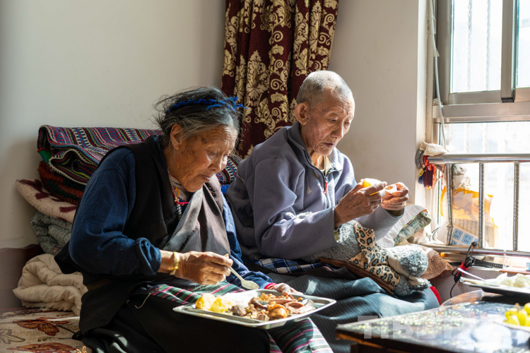 圖為次旦(右)和老伴德慶曲珍正在吃午餐 攝影:趙耀