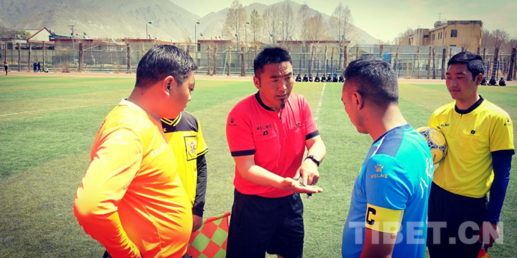 圖為旺堆次仁給即將上場(chǎng)比賽的雙方隊(duì)長(zhǎng)強(qiáng)調(diào)規(guī)則 攝影:晉美