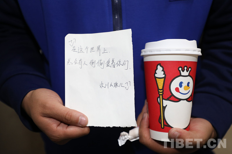 圖為汶川幺妹兒留的字條和送的奶茶