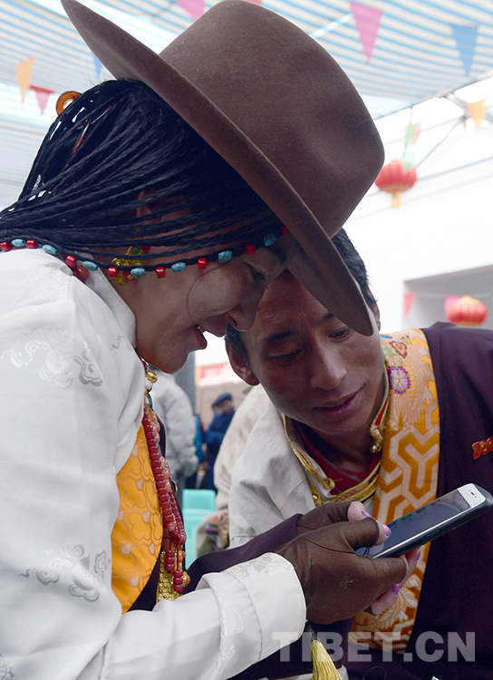 這是安多縣所在地帕那鎮(zhèn)的兩位著盛裝青年牧民在用手機了解外面的精彩世界(唐召明2021年9月15日攝)