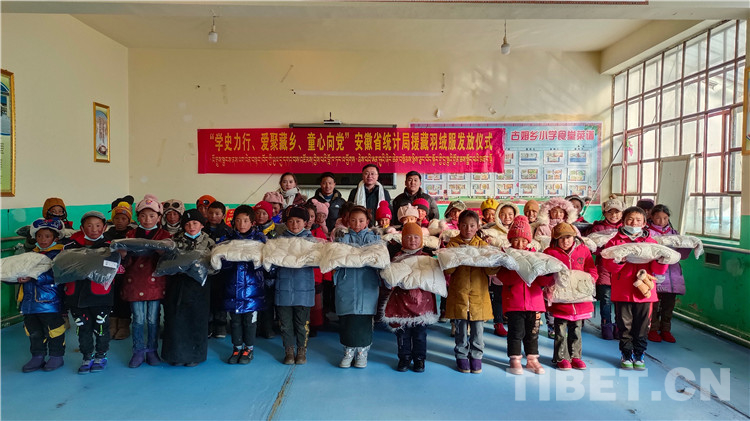 中國(guó)西藏網(wǎng)訊 “孩子們,排好隊(duì),快到食堂去領(lǐng)羽絨服?!?央吉措姆老師高興地對(duì)一年級(jí)的學(xué)生說(shuō)。待孩子們來(lái)到食堂,這里已是熱鬧一片,看到掛著“學(xué)史力行、愛(ài)聚藏鄉(xiāng)、童心向黨”愛(ài)心羽絨服發(fā)放儀式的橫幅,孩子們才恍然大悟,原來(lái)是援藏的叔叔給大家送新羽絨服來(lái)了。