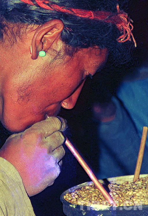 這是日喀則地區(qū)(現日喀則市)定日縣一牧民正在吸吮剛釀制好的青稞酒(唐召明1988年攝)
