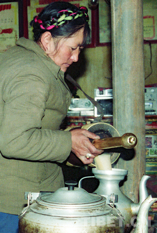 然后,她們又將煮好的濃茶,與酥油一道潷入另一個木制小酥油桶里,雙手握著長長的木塞,打起酥油茶。直到桶內聲音從“咣當、咣當”變成“嚓伊、嚓伊”時,茶、酥油、鹽等即混為一體,酥油茶便打好了。一天所需的酥油茶制作完工后,再去做其它事情……