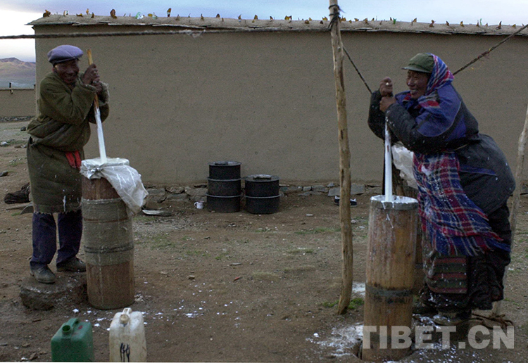 這是那曲地區(qū)雙湖特別區(qū)(現那曲市雙湖縣)嘎措鄉(xiāng)牧民正在打制酥油(唐召明2001年7月15日攝)