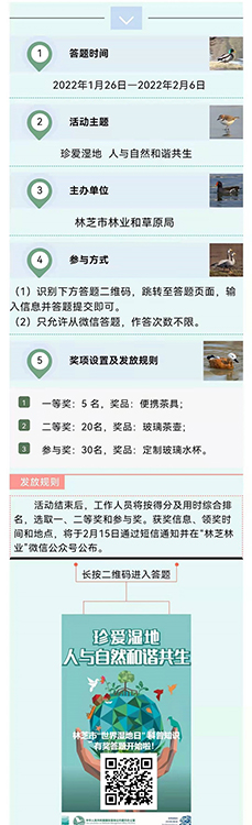 記者從“林芝林業(yè)”微信公眾號獲悉,為廣泛宣傳普及濕地保護(hù)知識,提升公眾濕地保護(hù)意識,進(jìn)一步激發(fā)廣大群眾參與濕地保護(hù)和生態(tài)文明建設(shè)的熱情,西藏自治區(qū)林芝市特意在第26個“世界濕地日”來臨前開展了“世界濕地日”有獎答題活動!