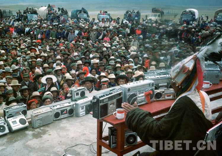 1987年盛夏的一天,藏北草原首府那曲鎮(zhèn)正在舉行一年一度的傳統(tǒng)賽馬會。只見這里各色帳篷林立,人山人海,商品交易繁忙。我遠(yuǎn)遠(yuǎn)看到,在一片寬廣的草地上,成百上千的觀眾盤腿坐著,靜聽露天舞臺上一個頭戴彩帽的人在比劃著什么。