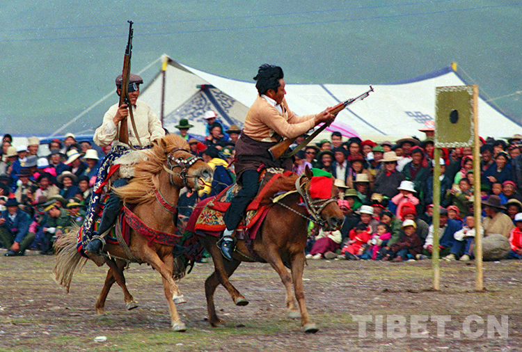 這是在那曲賽馬會上的跑馬射擊比賽(唐召明1987年攝)