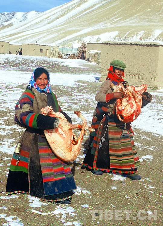 這是雙湖特別區(qū)(現(xiàn)雙湖縣)嘎措鄉(xiāng)一村兩位牧女從村里倉庫領(lǐng)到集體分配的羊肉回家(唐召明2001年攝)