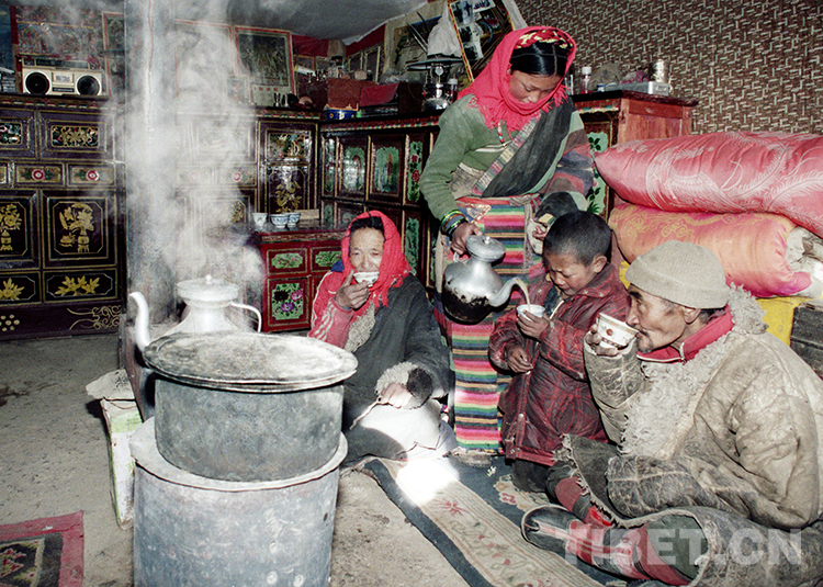 這是雙湖辦事處(現(xiàn)雙湖縣)嘎措鄉(xiāng)一村老牧人達(dá)加一家,正在新居里喝酥油茶(唐召明1988年攝)
