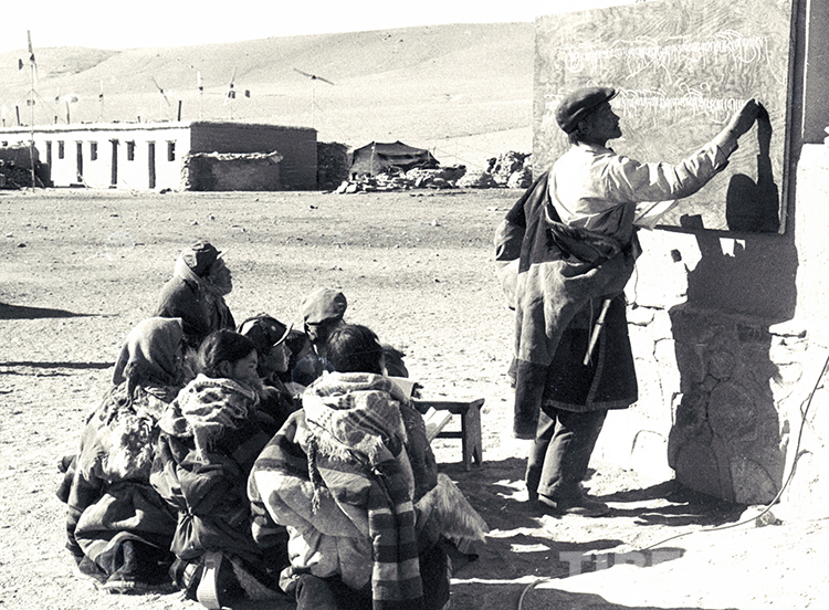 這是雙湖辦事處(現(xiàn)雙湖縣)嘎措鄉(xiāng)一村教師巴多在給孩子們上藏文課。巴多是村里唯一的教師,也是村里供銷社唯一的營業(yè)員(唐召明1988年攝)