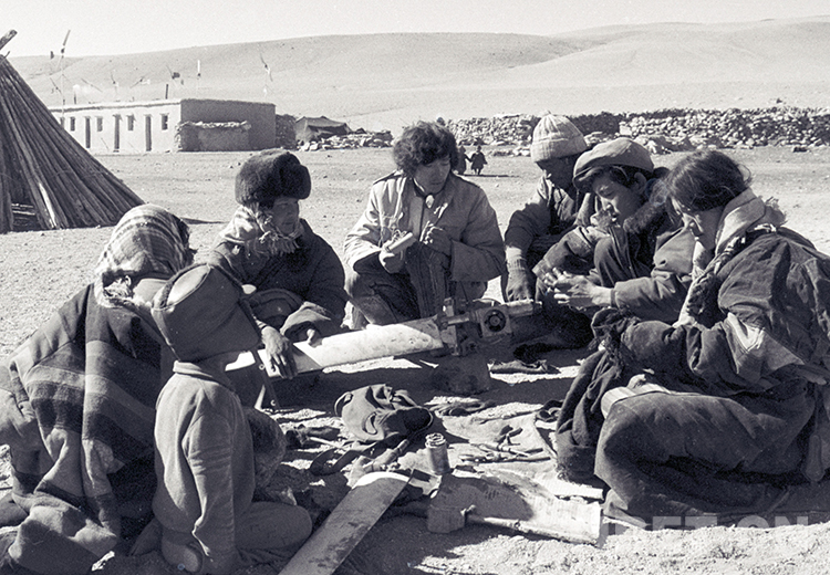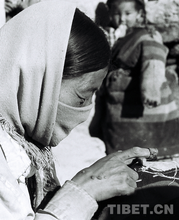 這是雙湖辦事處(現(xiàn)雙湖縣)嘎措鄉(xiāng)一村的一位牧女在為女兒縫制藏袍(唐召明1988年攝)