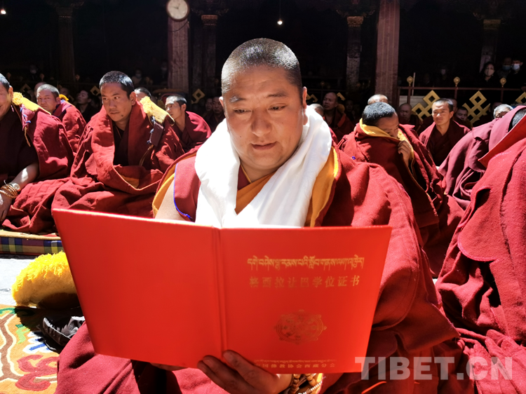 活動現(xiàn)場,西藏自治區(qū)人民政府副秘書長馬立柱代表西藏自治區(qū)人民政府向獲得學(xué)位的考僧贈送五彩緞、干果、袈裟和禮金;西藏自治區(qū)宗教局副局長達(dá)娃窮達(dá)向參加答辯活動的僧人發(fā)放布施;中國佛教協(xié)會西藏分會常務(wù)副會長、西藏佛學(xué)院院長珠康?土登克珠致賀詞,并代表班禪額爾德尼?確吉杰布會長向獲得學(xué)位的考僧獻(xiàn)哈達(dá)、頒發(fā)學(xué)位證書。
