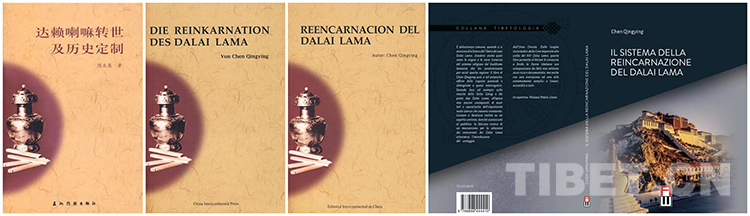 圖片分別為陳慶英著《達(dá)賴?yán)镛D(zhuǎn)世及歷史定制》漢文版、德文版、英文版封面和意大利文版封面封底