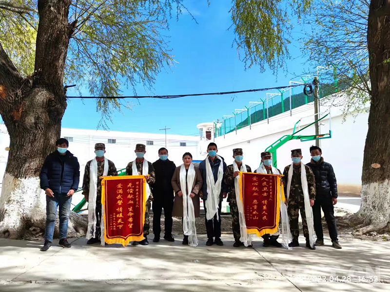 圖為洛隆縣人民醫(yī)院為光榮獻血的洛隆縣武警支隊官兵們送上錦旗