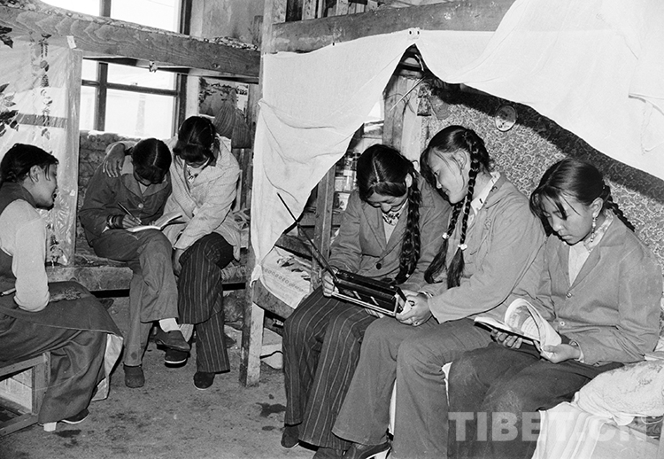 這是班戈縣中學(xué)寄宿女學(xué)生在宿舍里聽(tīng)廣播和學(xué)習(xí)(唐召明1987年攝)