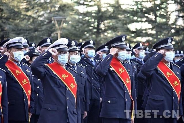 圖為2022年1月10日上午,西藏自治區(qū)公安廳組織民警迎接第二個(gè)中國(guó)人民警察節(jié)。現(xiàn)場(chǎng),全體民警舉右拳進(jìn)行人民警察誓詞宣誓