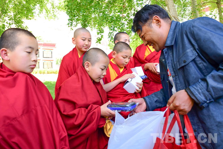 圖為佛學(xué)院老師代表相關(guān)單位向少年活佛贈(zèng)送節(jié)日禮物 攝影:拉姆