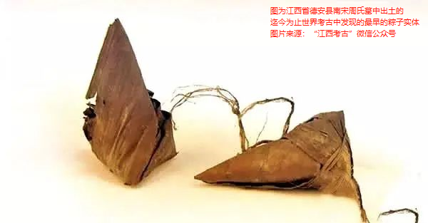 1988年,在江西省德安縣的南宋周氏墓中出土了迄今為止世界考古中發(fā)現(xiàn)的最早的粽子實(shí)體。有趣的是,開棺時(shí),工作人員發(fā)現(xiàn),墓主的手上拿著一根桃木枝,而桃木枝上掛著的,赫然是兩個(gè)實(shí)體粽子。用粽子作陪葬品很少見,據(jù)考古專家分析,墓主逝去于四月初十,大殮正值端午節(jié)前,可能生前愛吃粽子,所以就作為了陪葬品。據(jù)碑文記載,墓主周氏葬于公元1274年,所以,這是一對(duì)穿越了近750年時(shí)光來(lái)到我們面前的粽子。這對(duì)粽子呈菱角形,長(zhǎng)6厘米、寬3厘米,外皮為粽葉,用天然蘆葦葉麻線捆扎,制作手法和材料與我們現(xiàn)在的粽子非常相近。這對(duì)珍貴的南宋粽子目前保存在江西省德安縣博物館。