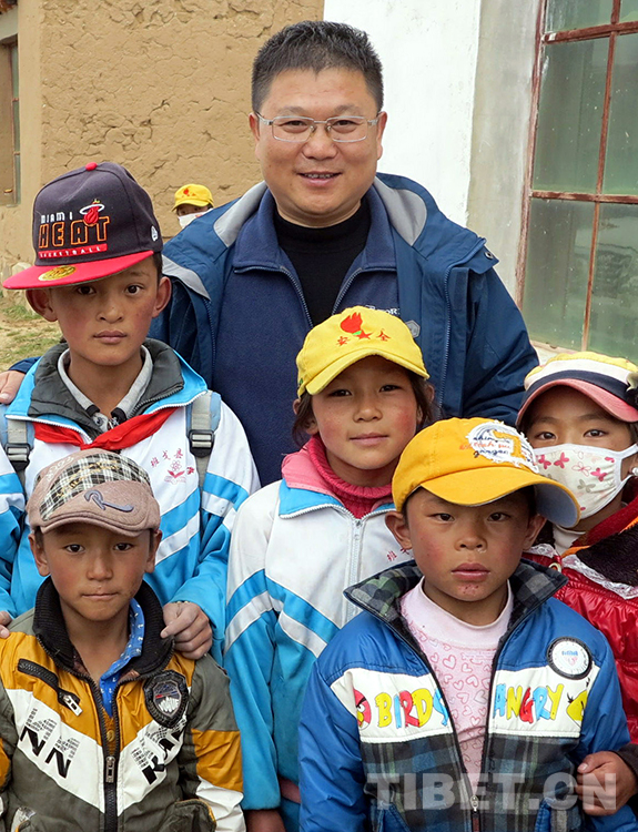 這是中國石化援藏干部王鵬雁與班戈縣小學(xué)的學(xué)生們合影留念(扎西2013年8月29日攝)