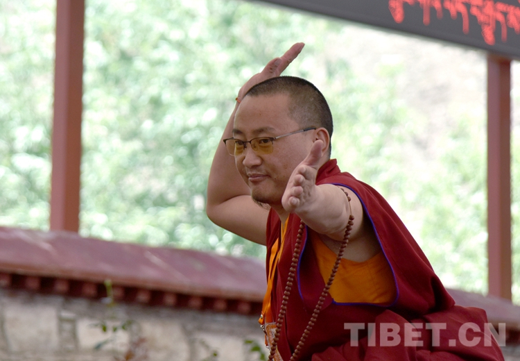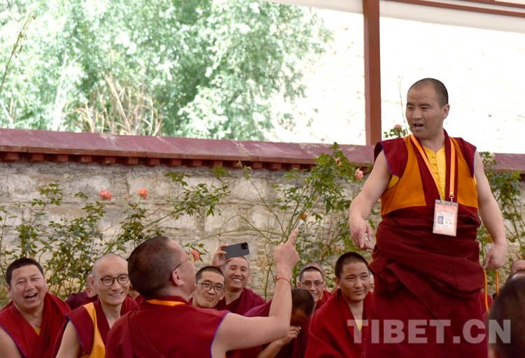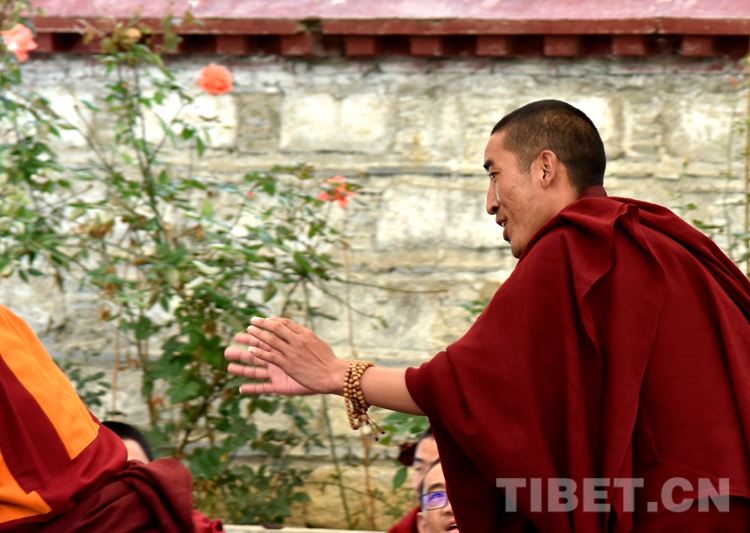中國西藏網(wǎng)訊 身穿絳紅色袈裟,坐者仔細(xì)聆聽、站立者臂套念珠、迸出佛學(xué)妙語;圍觀者不時(shí)大笑……這是6月21日下午記者在西藏佛學(xué)院辯經(jīng)場(chǎng)看到的“唇槍舌戰(zhàn)”。