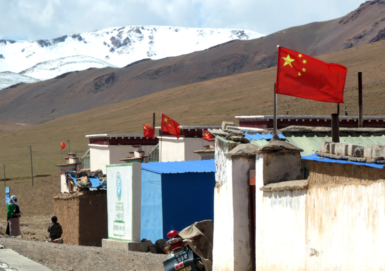這是申扎縣一處牧民安居房頂上飄揚的五星紅旗(唐召明2019年9月21日攝)