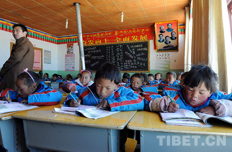 這是那曲縣(現(xiàn)色尼區(qū))羅瑪鎮(zhèn)中心小學的學生在窗明幾凈的教室里上課(唐召明2014年4月9日攝)