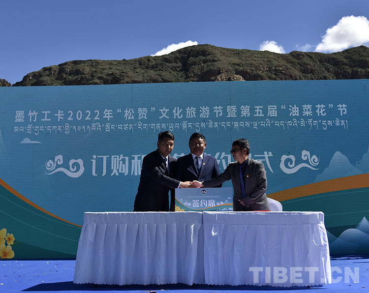 圖為墨竹工卡縣松贊文化旅游節(jié)暨第五屆油菜花節(jié)開(kāi)幕式上,墨竹工卡縣農(nóng)牧業(yè)凈土產(chǎn)業(yè)發(fā)展有限公司代表與唐加鄉(xiāng)、扎西崗鄉(xiāng)分別簽訂認(rèn)購(gòu)、預(yù)售合同 攝影:王媛媛