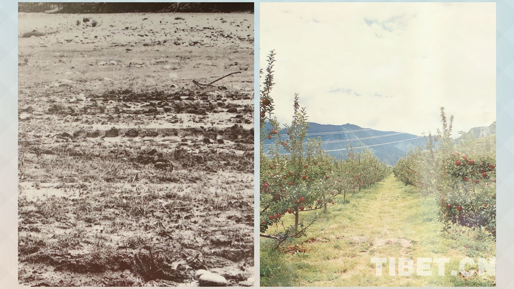 左圖,過去嘎拉村采摘園改造前的荒地;右圖,現(xiàn)在嘎拉村實施觀光采摘園項目。 孔夏翻拍自嘎拉村紅色研學(xué)主題教育展覽館