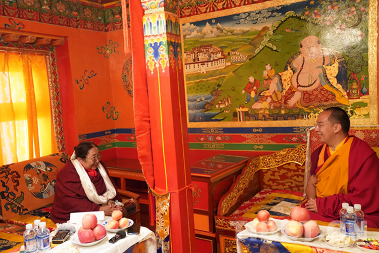 圖為班禪與桑頂多吉帕姆活佛敘舊交談 攝影:王淑